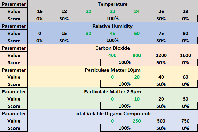 The total IAQ Score is the average of the 6 parameter's (Temperature, Humidity, CO2, PM10, PM2.5, and TVOC) scores. See the chart below for more information.