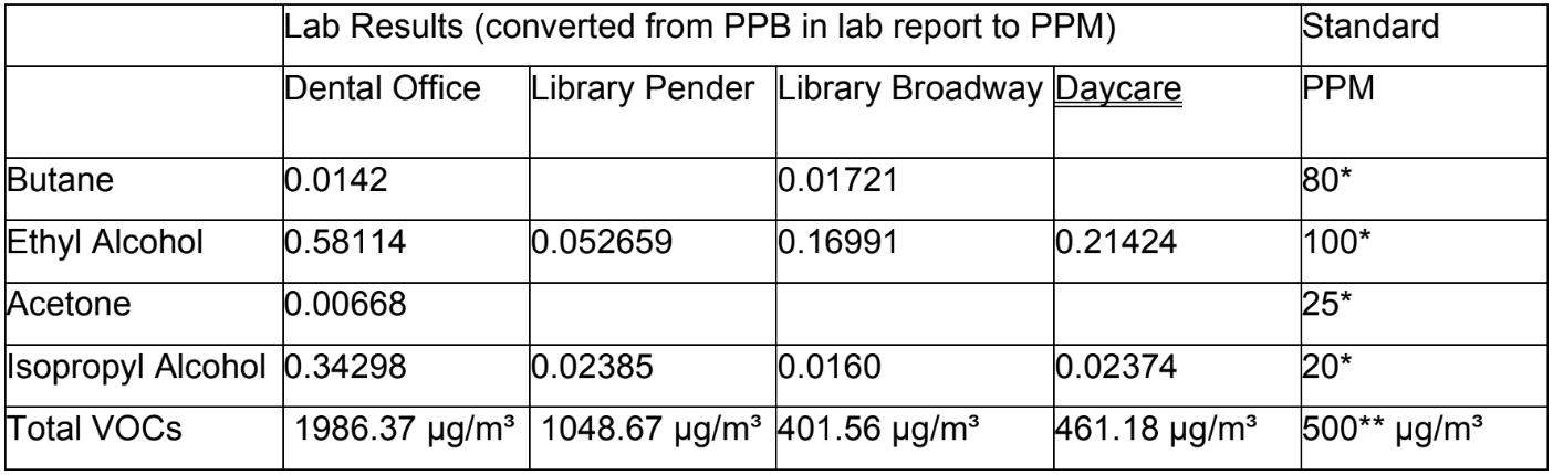 -Volatile Organic Compounds Volotile Organic Compounds (VOCs) are pollutants often found in building materials, cleaning products and other chemical reactions. VOCs include a wide array of compounds including ethanol, acetylene, methane, Formaldehyde and many others.Since detecting each of these compounds individually can be complicated and expensive, it is often easier to determine instead the Total of the VOCs in the area (or TVOCs) and find areas where the total concentration is high and then perform individual analysis. TVOC concentration should not exceed an average of 250 ppb for optimal healthy environments.